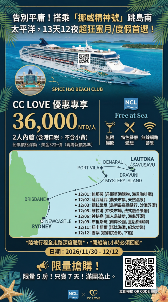 📍 夢幻航線:斐濟出發 ➔ 玩轉萬那杜 ➔ 澳洲雪梨壯麗登岸 💰 破盤專案價:每人只要 NT$36,000!(內艙兩人一室,已含港口稅)